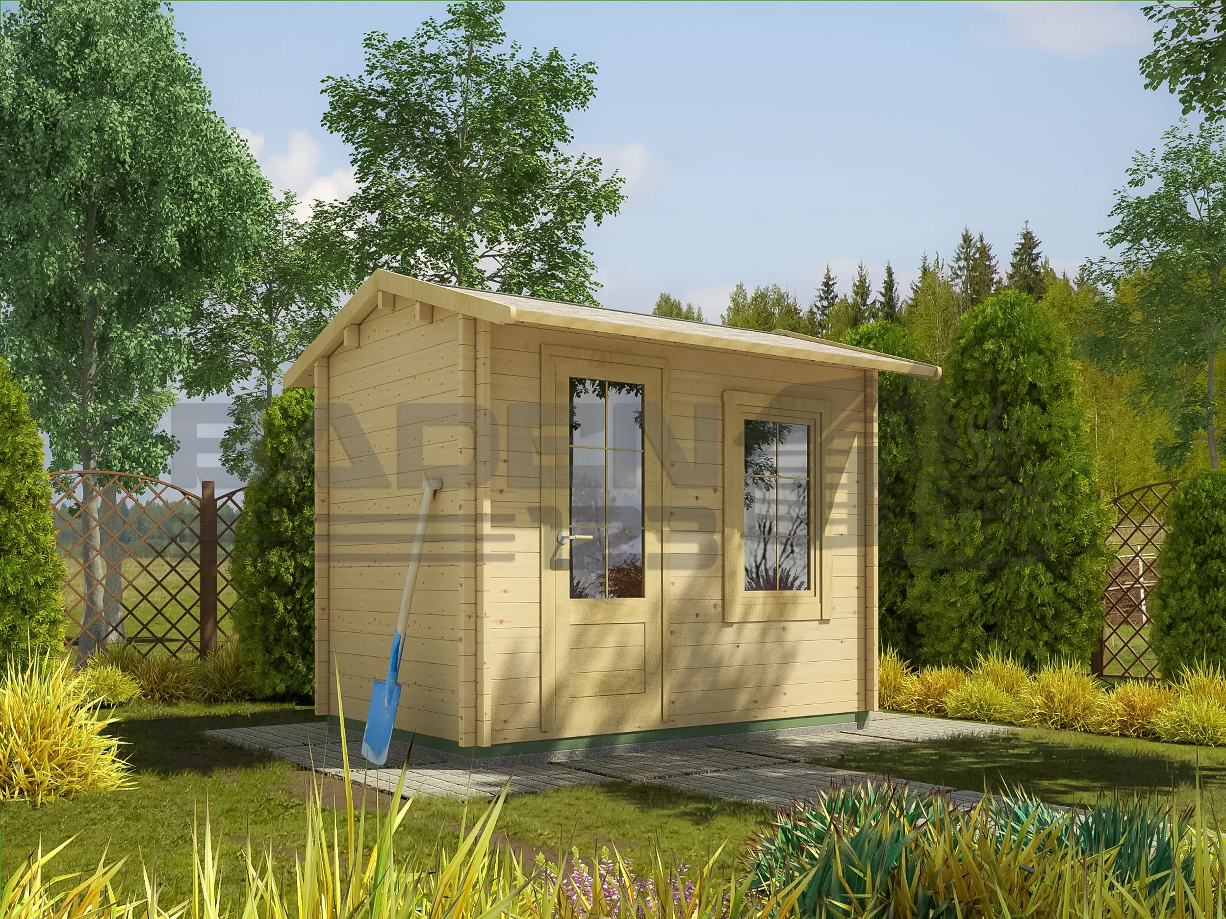 Een compact houten tuinhuisje dat door zijn afmetingen ideaal is voor een kleine plek tegen een muur of schutting. Het heeft een raam en een glazen deur, waardoor het vrij licht is. Het is niet alleen ideaal voor het opbergen van diverse spullen of gereedschap, maar u kunt er ook uw eigen miniwerkplaats, naaikamer of andere werkruimte in inrichten.
